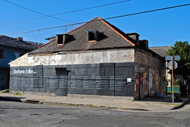 Do you have a bucket list? Things you want to do before you die? This is the question that Candy Chang is asking her neighbourhood. Candy Chang is a public installation artist from New Orleans who likes to make cities more comfortable for people. She turned the side of an abandoned building into a giant chalkboard. On this chalkboard, people can write down their hopes and dreams and remember what is important to them.
